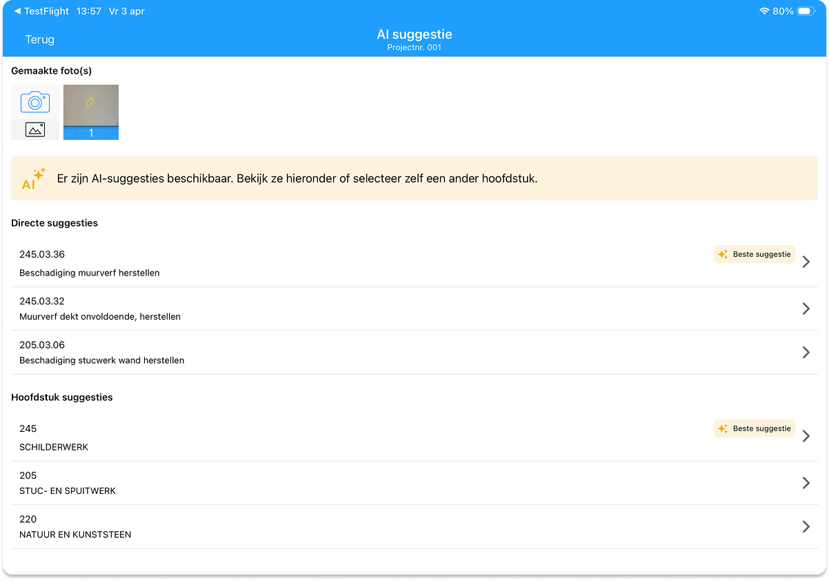 In de STA app vindt je naast de reguliere manier van opnamepunten toevoegen nu ook een AI knop. Als je hier op klikt opent de camera direct en kun je foto’s maken zoals je gewend bent. Nadat je op opslaan klikt krijgt je 3 AI suggesties van de meest overeenkomende omschrijvingen en hoofdstukken. Klik op een suggestie en je kunt het opnamepunt verder aanvullen
